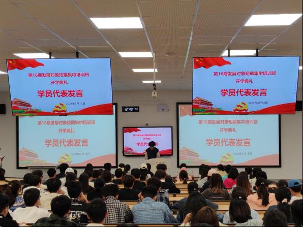 学员代表随后发言,承诺在培训中努力学习,遵守纪律,积极向党组织靠拢,坚定理想信念,提高思想觉悟,展示新时代大学生的责任与担当。