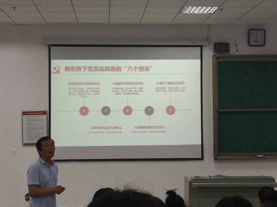 任峥老师以《不忘初心,牢记使命—立足岗位作贡献》为主题为学员们授课。主要从以下四个部分进行讲述:一是何为“初心”;二是深刻理解担当精神的现实内涵;三是学生党员如何尽职担当;四是新形势下党员应具备的“八个担当”。首先,任峥老师从何为初心开始进进深入的讲解,所谓初心是“人之初、性本善”的那份纯真,是“人生若只如初见”的那份美好,还是“不畏浮云遮望眼”的那份勇气,亦或是“惯看秋月春风”的那份淡泊?到党的初心,是时刻体现着责任担当,体现在带领中国人民“站起来”上,还体现在带领中国人民“富起来”、“强起来”上,不忘初心意味着责任与担当。