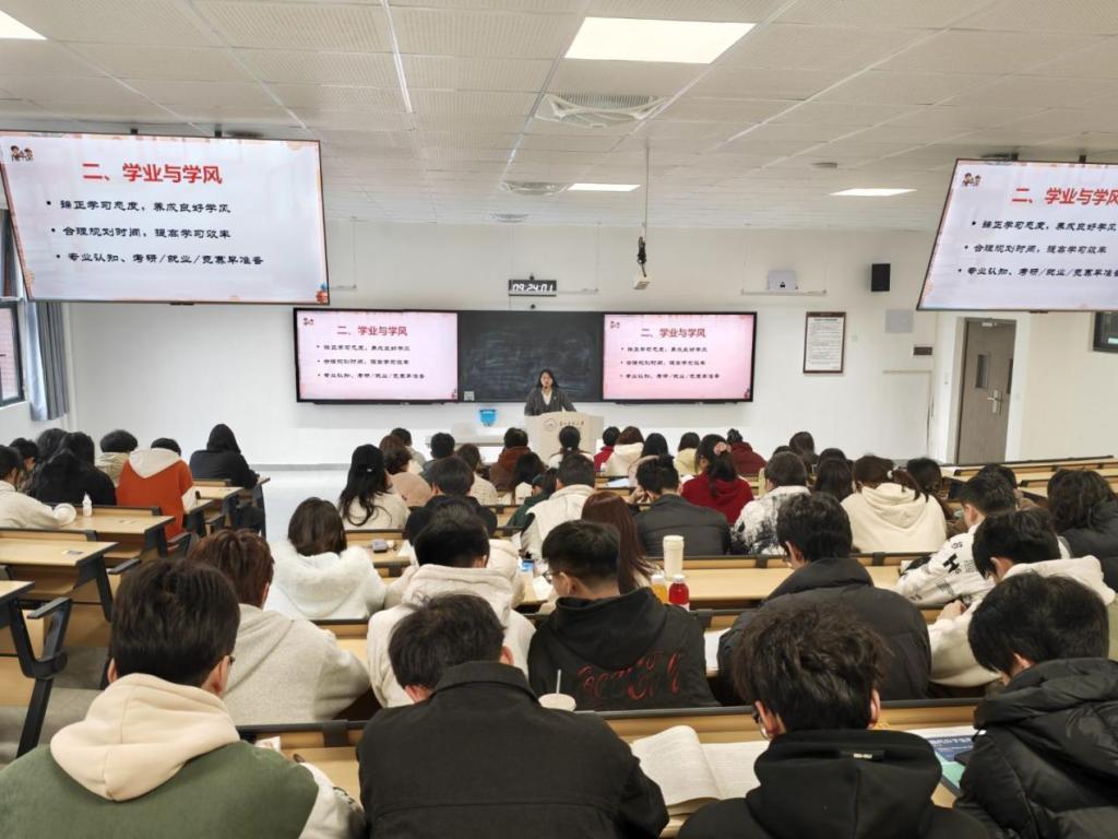 辅导员张佳佳围绕思想与成长、学业与学风、安全与法治、心理健康、品德行为、生活自律六个方面作详细讲解,结合典型案例引导同学们端正学习态度、科学规划时间、强化安全意识、调适心理状态、严守校规校纪、养成良好习惯,为同学们适应大学生活、实现全面发展提供了具体指导。