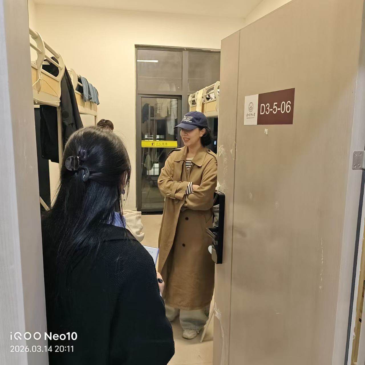 张佳佳重点查看了寝室卫生状况和用电安全,叮嘱同学们务必遵守学校公寓管理规定,杜绝违规电器,注意防火防盗,共同营造安全、整洁、和谐的住宿环境。她还提醒同学们注意春季传染病预防,保持良好作息,以健康的体魄和饱满的精神投入到新学期的学习生活中。