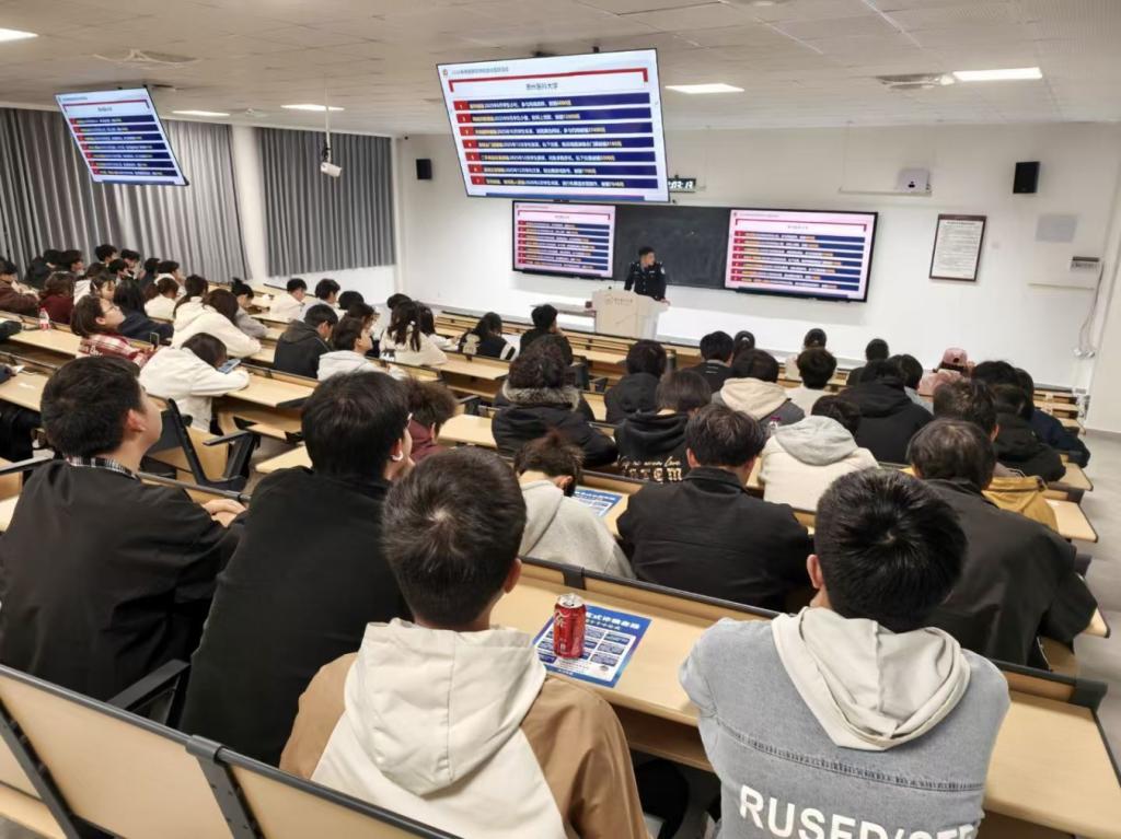 宣传过程中,宣讲民警采用“专题讲座+多维宣传”的多措并举模式,构建全方位反诈防护网。线下,民警通过专题讲座,详细讲解诈骗识别技巧、应对方法及报警流程,叮嘱学生坚守“不轻信、不透露、不转账”原则;线上,班级群实时推送反诈知识与预警提示。同时,教学楼、宿舍区同步开展海报张贴、横幅悬挂、宣传资料发放等活动,营造浓厚反诈氛围。此外,吉祥体育