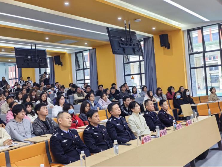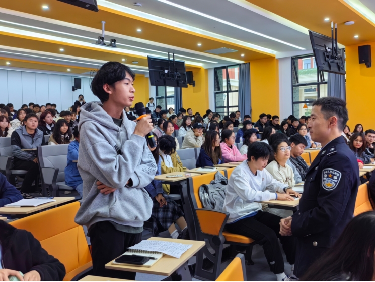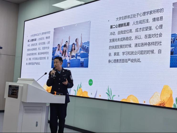 刘正东警官以“青春心启航”为主题,为同学们展开了一场关于大学生心理健康的讲座。刘正东从宿舍人际关系、与父母的相处之道、情感纠葛以及毕业在即可能遇到的心理调整等四个方面出发,引导学生学习如何自我管理,认识并尊重差异性,并主动沟通,学会在多样性中寻求共识。此外,讲座旨在为学生与同伴、教师与学生,以及家长与学生之间建立起心理沟通的桥梁,帮助他们更好地理解与支持彼此。“尽管人生难免有起有落,但我们不能让烦恼永远笼罩心头。”这是刘警官在讲座中给同学们的温馨寄语。