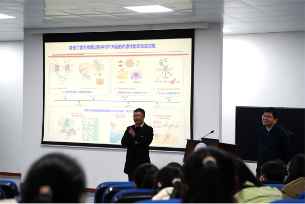 孙金鹏教授讲座的主题为“类固醇激素膜受体亚家族的发现和GPCR对微环境的感知”。讲座伊始,他介绍了自己在国外的研究经历、回国初期开展科研工作中遇到的困难以及克服困难后取得系列标志性成果的过程,勉励大家要有耐心,扎实打好科研基础,突破瓶颈期后一定会取得丰硕的成果。他解析了膜受体是感知细胞外信息的枢纽,将参与感知并决策,受体概念的提出和GPCR家族的发现,GPCR所感知的荷尔蒙等科学问题,同时介绍了课题组的主要研究方向及目前取得的重要学术成果。孙金鹏教授与现场师生积极互动交流,还介绍了目前法医领域有关动脉粥样硬化、神经损伤修复、新精神活性物质成瘾机制等方面的研究前景。