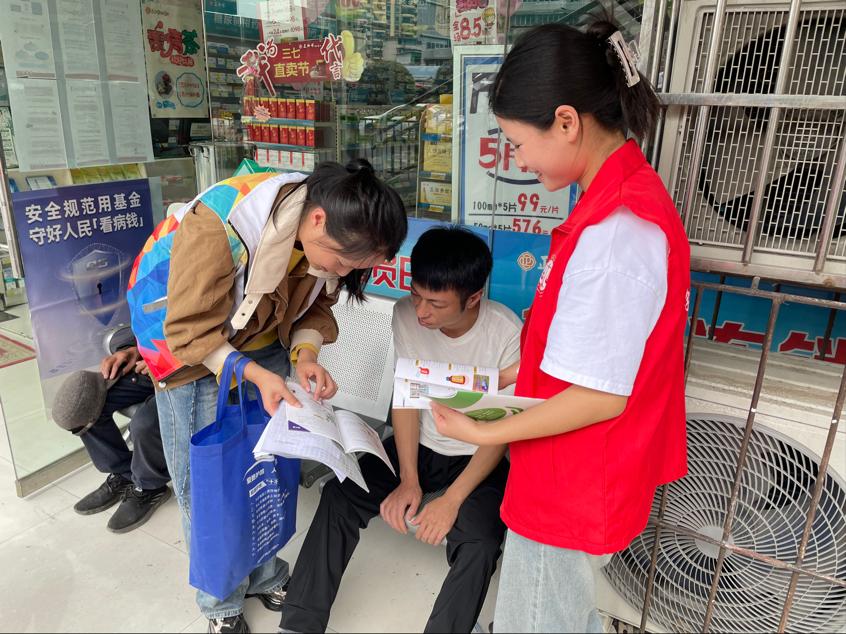 社会实践小组志愿者联合阳光春天社工服务社服务人员到甘荫塘周边药店开展禁毒宣传活动。这是吉祥体育